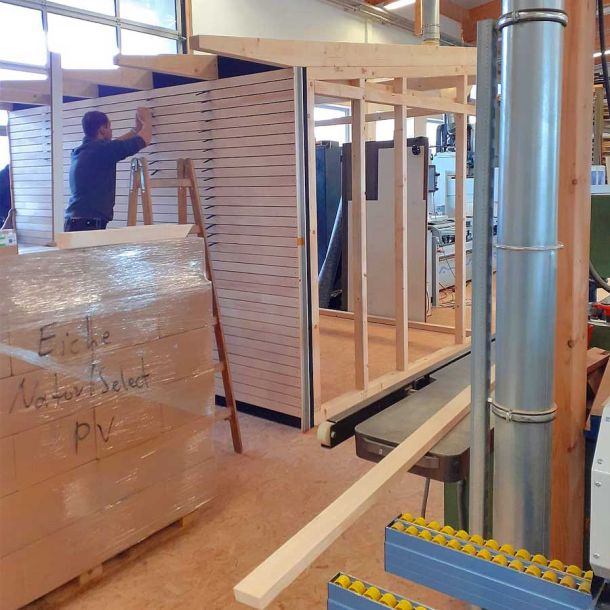 Für Fertigung, Büro, Ausstellung und Lager stehen heute rund 1000 m² Fläche zur Verfügung. Gleichzeitig wurde der Maschinenpark für eine maximale Flexibilität erweitert und ist mit neuen hochfunktionellen Holzbearbeitungsmaschinen auf dem neuesten technischen Stand. Mit einer modernen, automatischen Anlage wird die gesamte Heizenergie aus den eigenen Holzabfällen gewonnen.